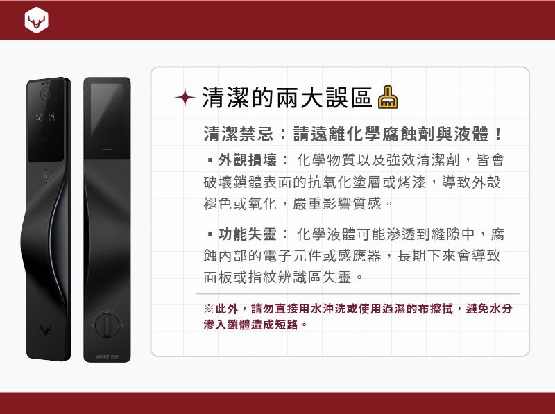 ⚠️此外,請勿直接用水沖洗或使用過濕的布擦拭,避免水分滲入鎖體造成短路。
