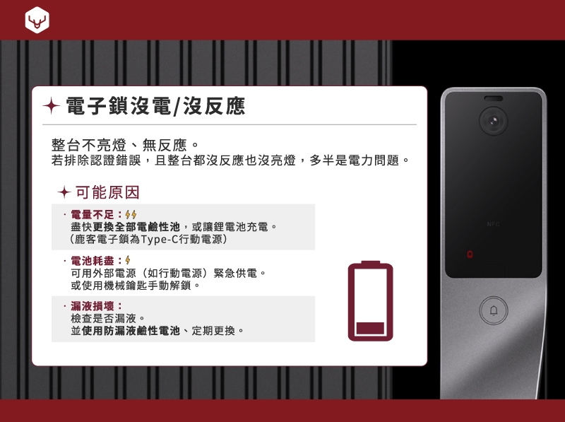 • 電量不足:盡快更換全部電鹼性池,或讓鋰電池充電。(鹿客電子鎖為Type-C行動電源)