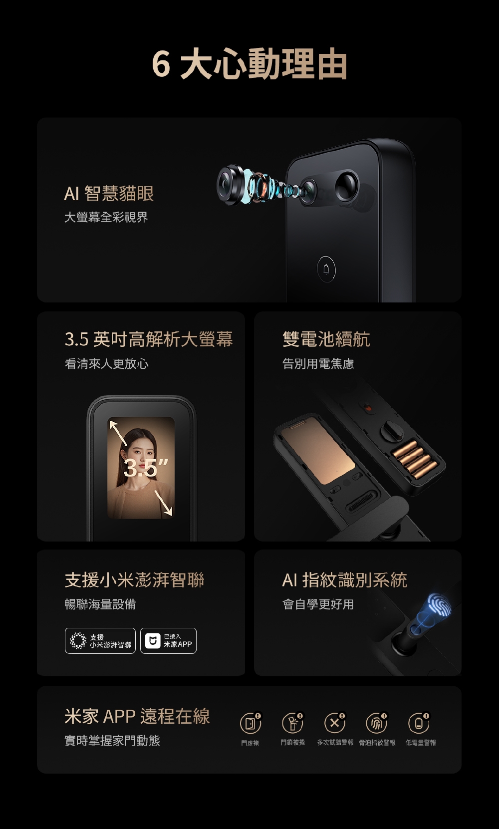- AI 指紋辨識系統,具備自我學習功能,每次識別解鎖都在豐富且更完善指紋數據內容。更精準快速。