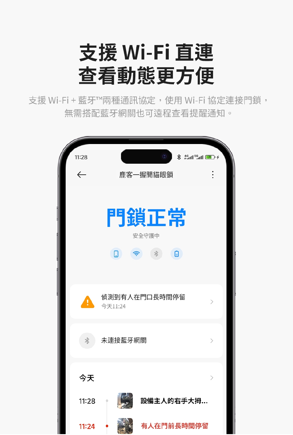 - Wi-Fi 無須搭配網關,讓用戶可透過手機應用APP程式遠端管理門鎖,包括查詢紀錄及設定臨時密碼,提升居家安全與便利性。