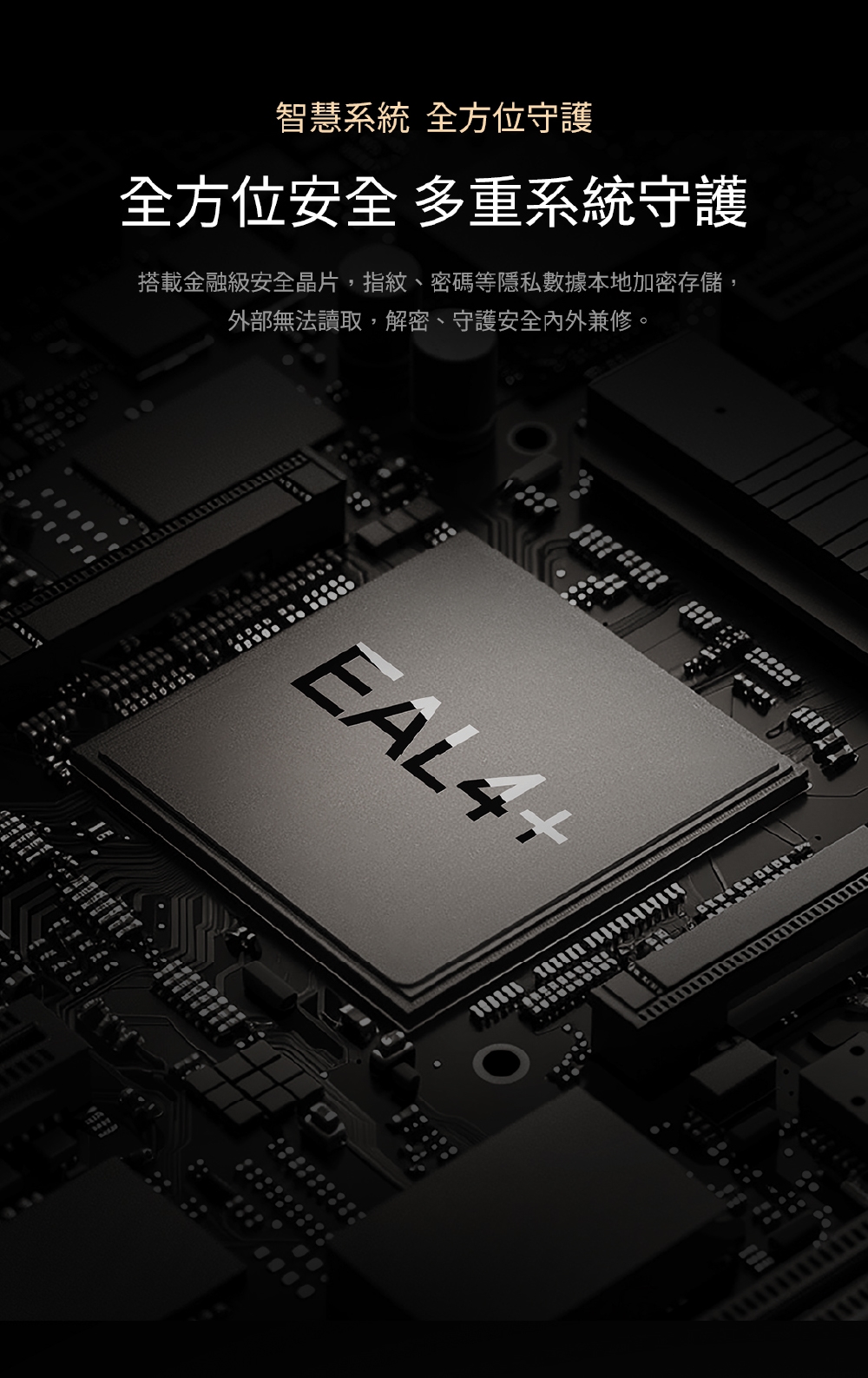 - 金融級安全晶片搭載。密碼、指紋等隱私數據本地加密儲存。無法從外部讀取級解密,隱密且安全。