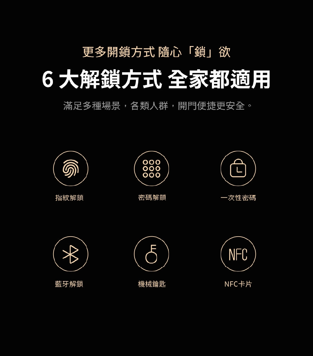 - 此外,多元解鎖方式 (指紋、密碼、卡片、鑰匙、遠端、藍牙) 滿足不同使用需求。